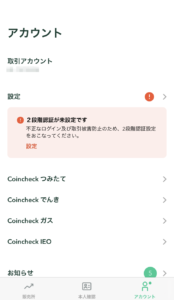 再度コインチェックのアプリが開きます。今度はログインが完了しています。右下のアカウントをタップして、二段階認証を設定します。