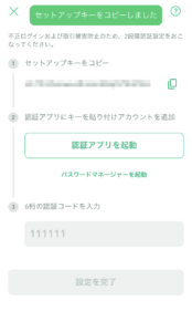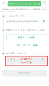 6桁のコードが表示されます。コードをタップするとコピーができます。このコードは一定の時間が過ぎると変更になります。その前にコインチェックのアプリに戻ってペーストをしましょう。