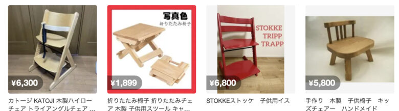 メルカリにおいて「子ども 椅子」で検索すると多くの商品がヒットします。